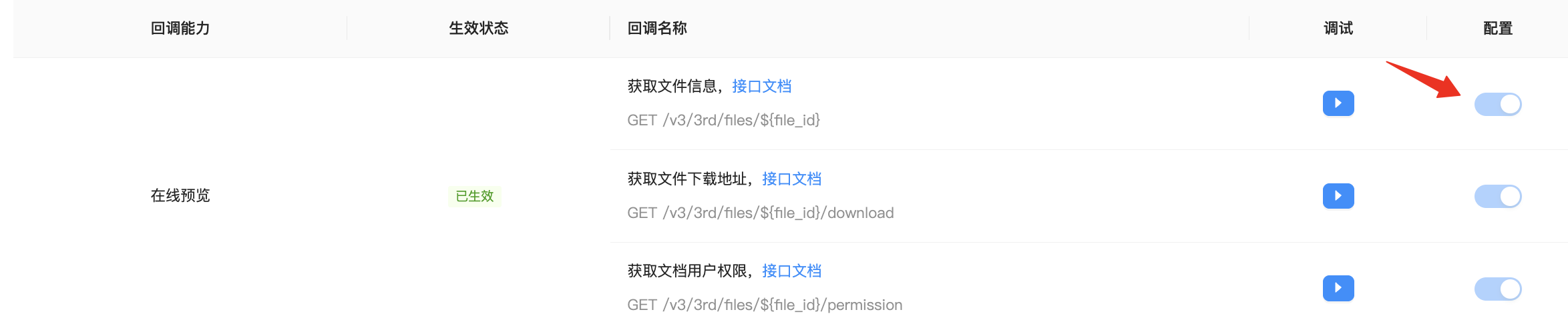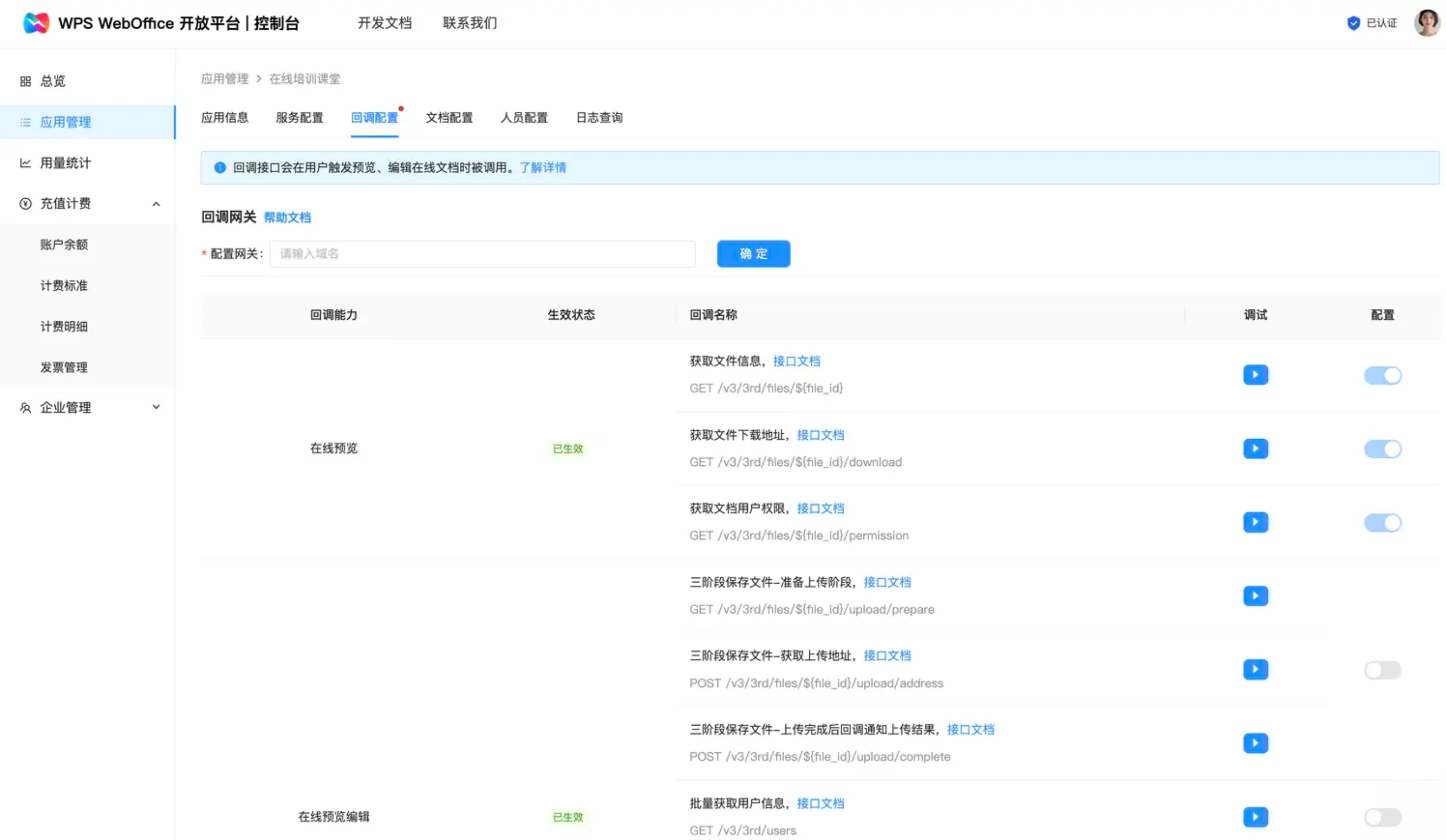 假设网关地址为https://www https://www.****.com:####,回调接口地址是 /v3/3rd/files/${file_id},则完整的回调接口地址就是 https://www .****.com:####/v3/3rd/files/${file_id}。 通过 API 列表最后的 “调试” 按钮,可以用来测试你的服务,能否被 WebOffice 服务器 访问到,这一点很关键。